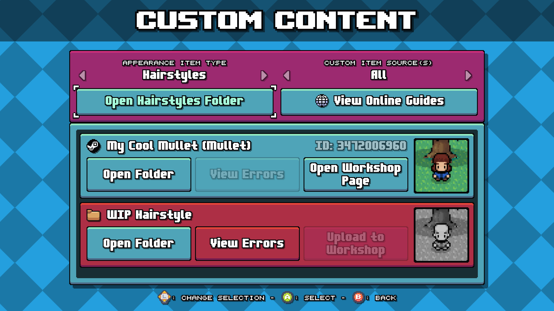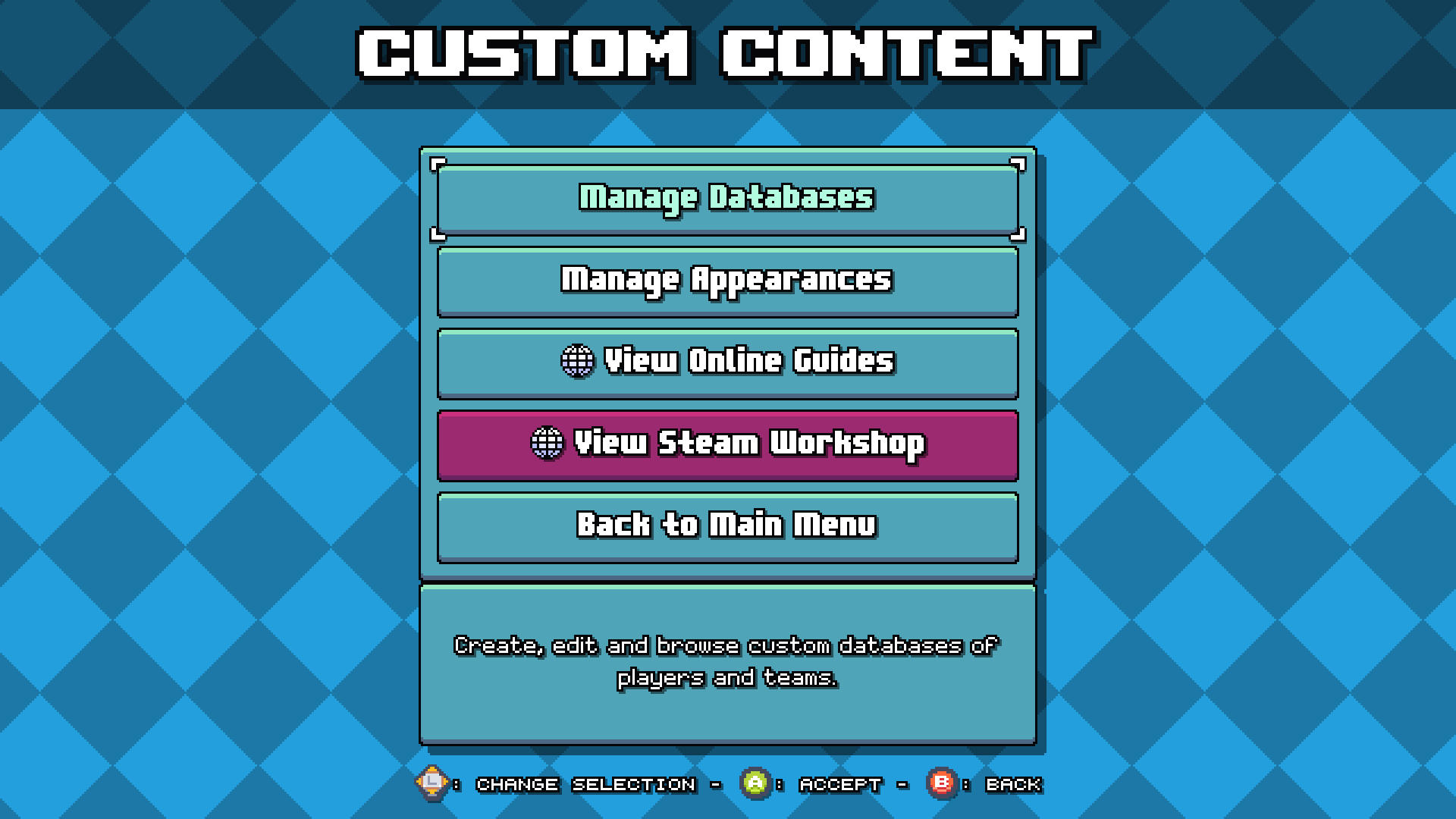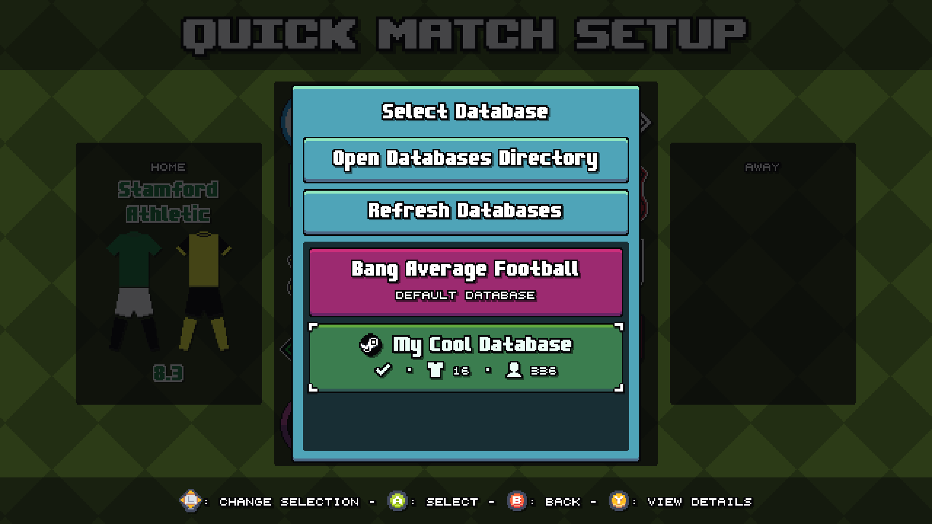 Custom content can be loaded from files saved in Bang Average Football's local data folder, or installed by subscribing to items on the Steam Workshop.